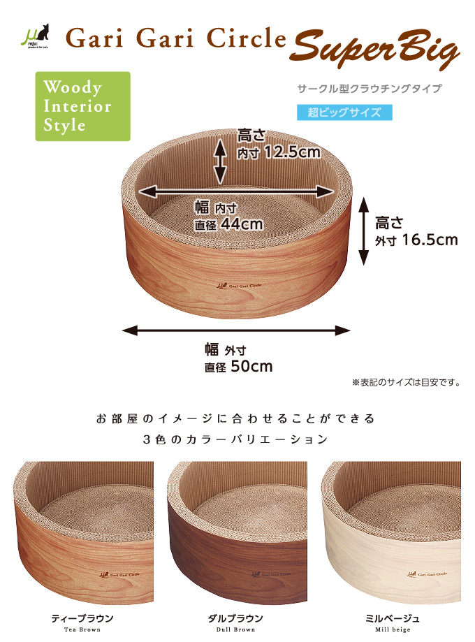 愛猫たちが最高にくつろげるように開発された愛猫専用の爪とぎです。愛猫がすっぽり丸くなってくつろげる、サークル型クラウチングタイプの超ビックサイズです。爪とぎ時の削りカスが飛び散りにくい構造設計になっています。愛猫がどこでも爪をとげるように、内側はすべて段ボールの爪とぎ素材を使用、硬質の底面(横目)と軟質(縦目)があります。さらに、愛猫が興味を示さないときに、爪とぎにふりかける「またたび」を付属しています。