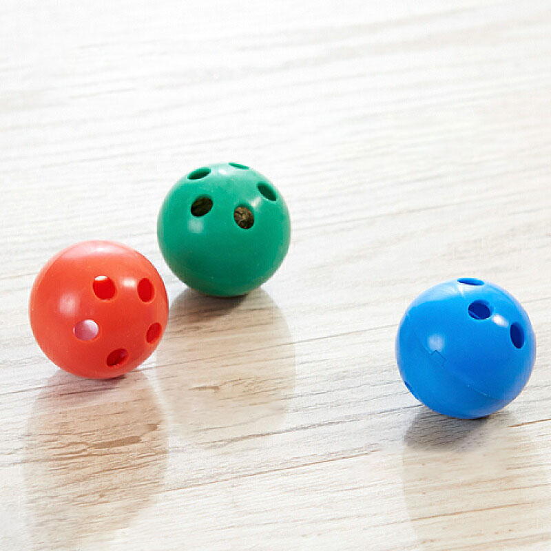 愛猫たちが最高に楽しめるように開発された愛猫専用の爪とぎ付きボールトーイです。穴の中をころころと転がるボールを追いかけて遊びます。3色のボールは猫にも色の違いを目で見て分かるカラフルな色を採用。赤色と青色のボールには鈴が入っていて鈴の音がしたり、緑色のボールにはキャットニップが入っていて猫の好きな香りがします。広い爪とぎ部はひっくり返して裏面も使用できます。裏面で使用する場合は、裏面のとぎカス防止板をカッターナイフなどで切り離し、反対側の爪とぎ部分にとぎカス防止板でフタをしてご使用ください。
