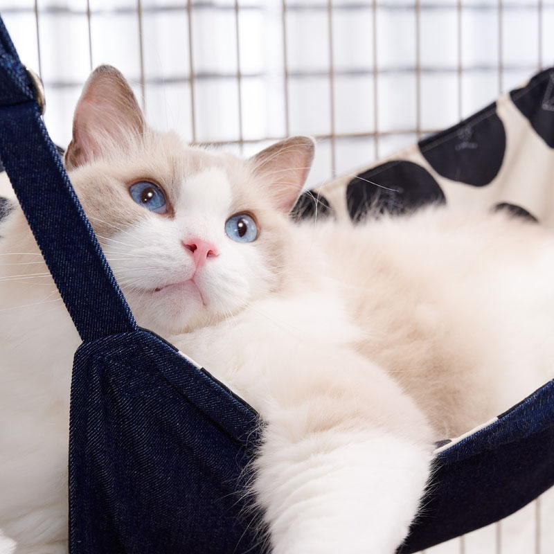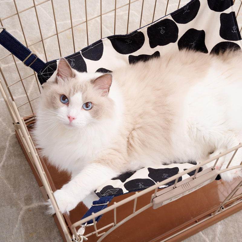 新機能としてフックひもの長さを調節できるようになりました。省スペースでもより安定して取付けることができます。取り付けはケージなどにフックで引っ掛けるだけです。北欧テイストの猫柄と白猫&黒猫のモノクロカラーで、優しくしっかりとした生地を全面に使用しています。飽きのこないモノクロの色合いで、2色(黒地に白猫、白地に黒猫)から選べるカラーは、インテリアにもぴったり。落ち着きのあるカラーが大人っぽさも演出します。裏地は丈夫でしっかりとしたデニム生地を使用しています。1年をとおしてご愛用いただけます。