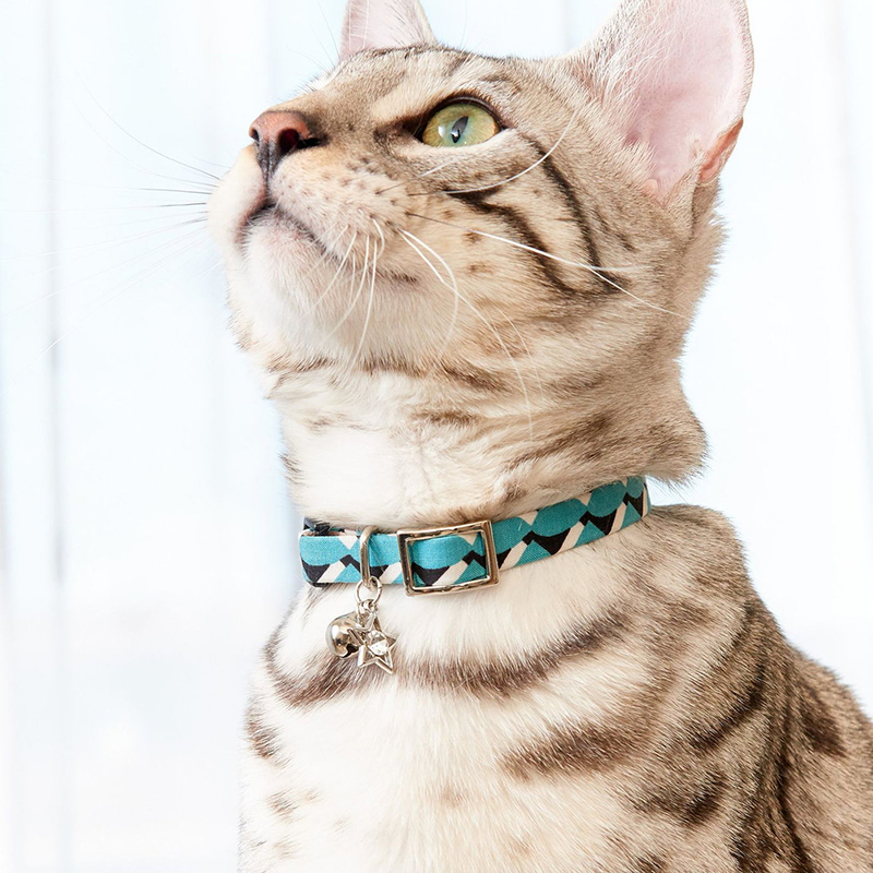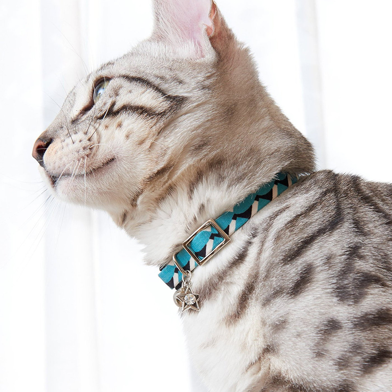 オシャレなトライアングル柄の生地には、しっかりとしたレーヨン100%の素材を使用しています。裏生地にはポリエステル100%を使用。SとMの二つのサイズがあり、それぞれ長さを調整できます。調整金具にはシンプルなシルバーを使用し高級感を演出します。付属のチャームは星をモチーフにしたかわいいスタージュエリーです。小さな銀の鈴も付いています。強い力が加わると安全にはずれるセーフティーバックルを採用。万が一首輪に引っかかっても安心です。