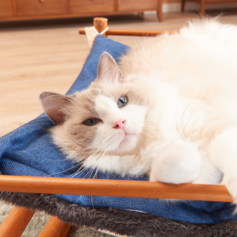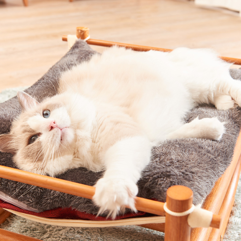 キャットハンモック(別売)は、雲の上にいるような気持ちよさを演出し、木製ならではのやさしい風合いと、しっかりとしたスタンドが特長です。コットン製のマットとクッションの2重構造で、ふわふわで安定した寝心地を実現。きっと極上の昼寝ができることでしょう。キャットハンモック 詳細ページ>>