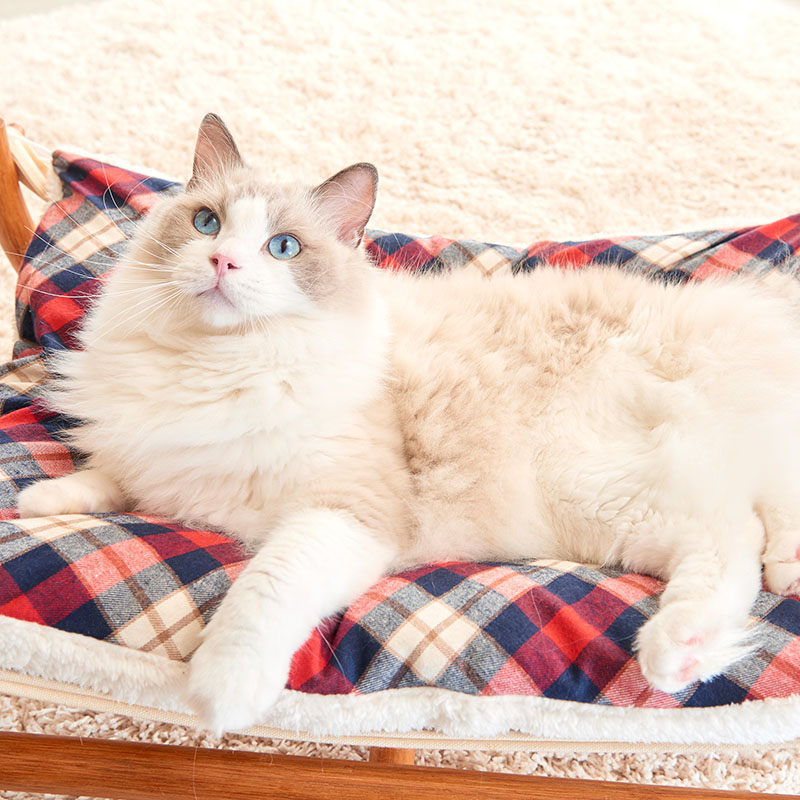 キャットハンモック(別売)は、雲の上にいるような気持ちよさを演出し、木製ならではのやさしい風合いと、しっかりとしたスタンドが特長です。コットン製のマットとクッションの2重構造で、ふわふわで安定した寝心地を実現。きっと極上の昼寝ができることでしょう。