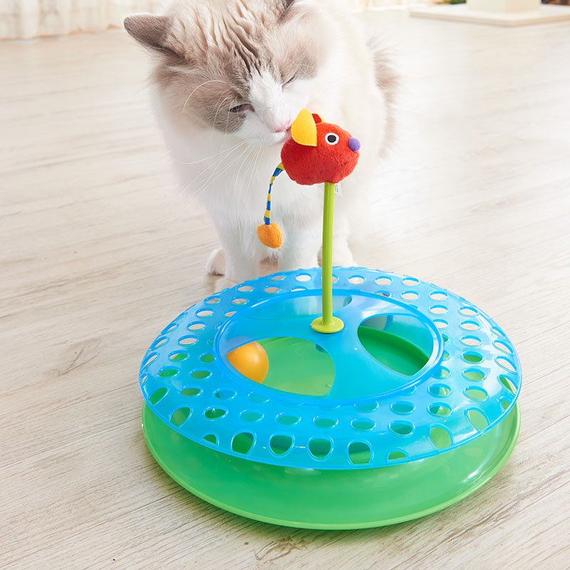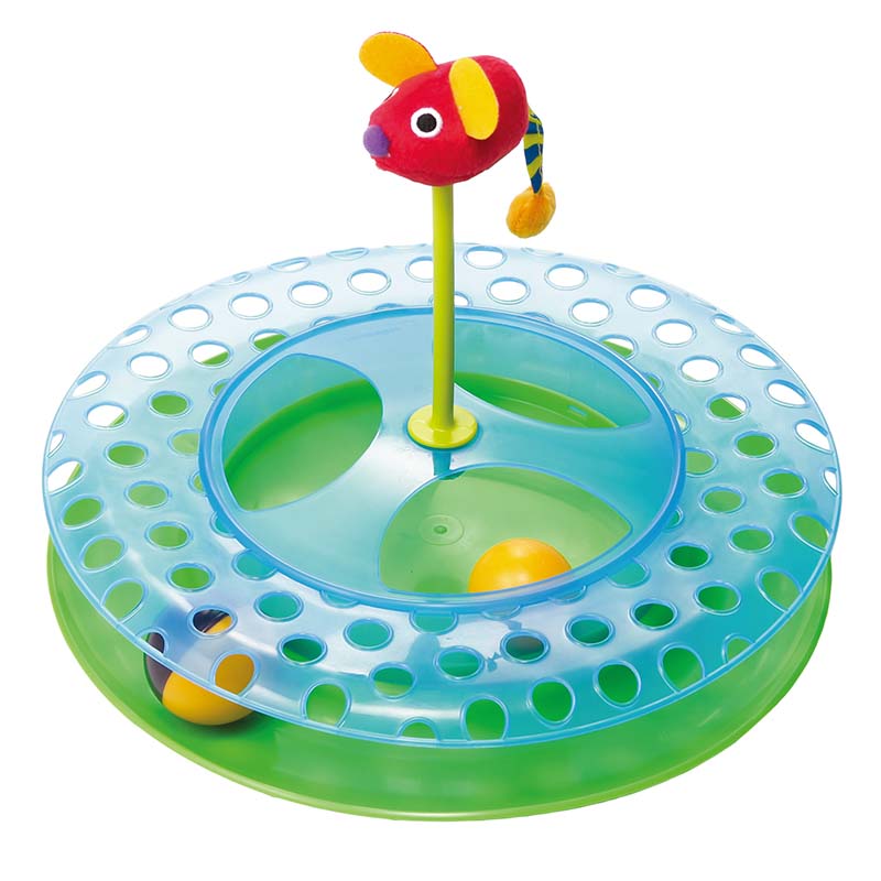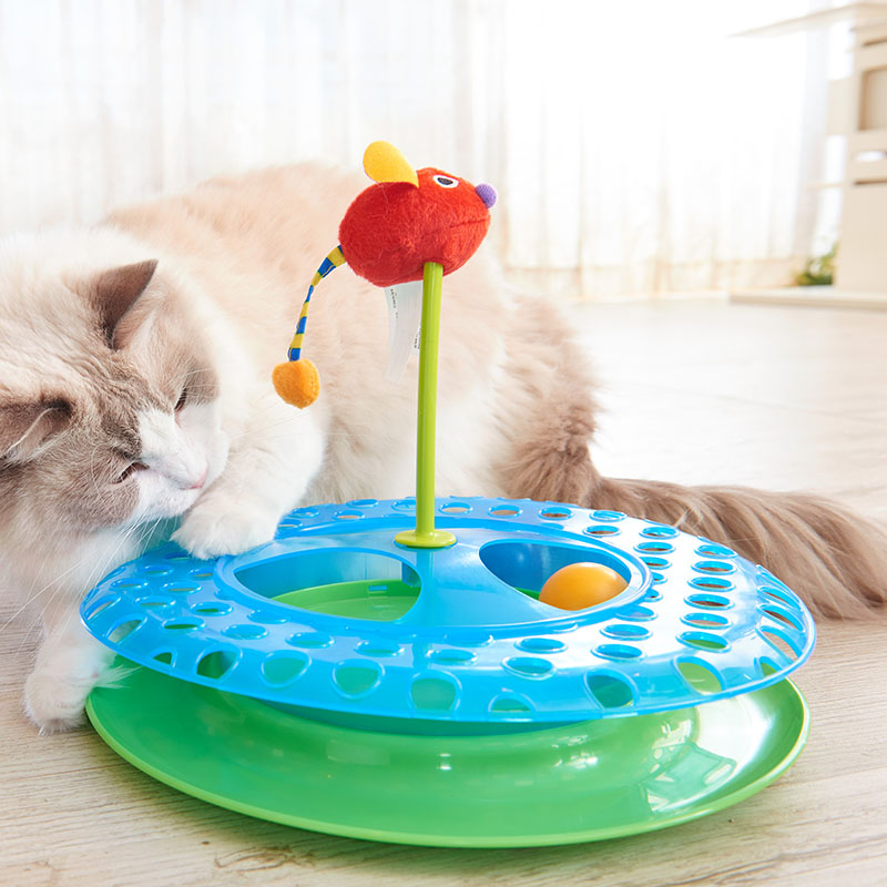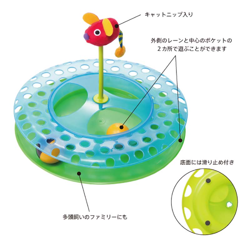 外側のレーンと中心のポケットの2カ所で遊ぶことができ、多頭飼いのファミリーにもネズミのおもちゃの中にはキャットニップが入っているので、猫の興味を惹きつけます。フローリングの上でも遊びやすいように、商品底面には滑り止めが付いています。