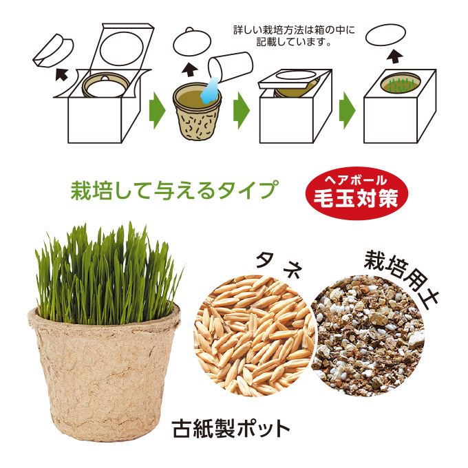 「犬と猫が好きな草の栽培セット」は、「猫が好きな草」(通称:猫草)をご自宅で簡単に栽培できる古紙製ポット、タネ、栽培用土のセットです。タネまき済みですので、水を与えるだけで栽培できます。栽培開始後、約10日間で成長します。新鮮な草を安全に栽培し与えることができます。胃腸の中にたまった毛玉(ヘアボール)などを吐き出させ、愛猫の健康維持をサポートします。ポットは環境に配慮した地球にやさしい100%古紙を使用しております。ペットたちが草や葉を食べているのを見かけませんか?ペットたちが草を食べるのは本能的な習性です。しかし、植物の中にはペットたちに有毒なものが多く、屋外の雑草は農薬やバイ菌などの危険がいっぱいです。「犬と猫が好きな草の栽培セット」は、ペット専用に栽培。新鮮な草を安全に与えることができます。毛玉(ヘアボール)による胃もたれや胸やけを解消、毛球症の予防に。