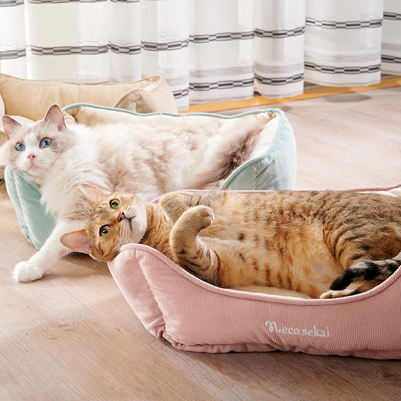 necosekai キャットスクエアベッドは、どんな季節でも猫ちゃんが快適に過ごせるように、上質さと居心地にこだわったスクエア型のキャットベッドです。