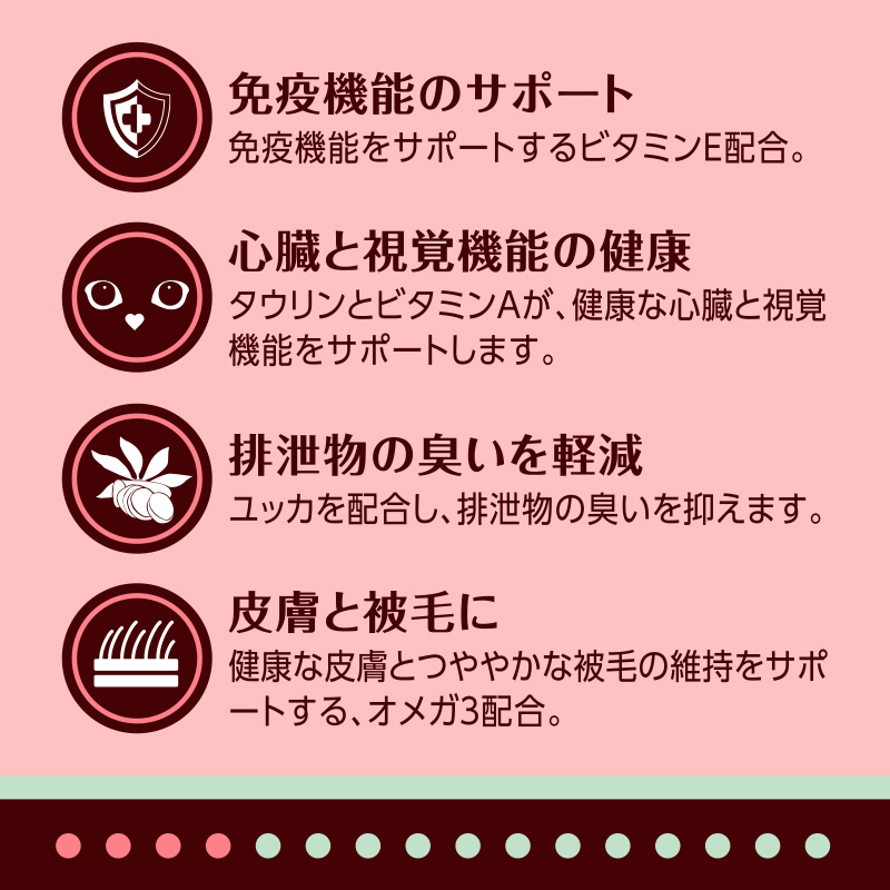 ターキーは、必須アミノ酸を豊富に含む低脂肪のタンパク源です。また、リボフラビン、カリウム、セレニウムなど、必須栄養素の摂取源としても優れています。サツマイモは、低脂肪で食物繊維を豊富に含み、消化器官の健康をサポートします。生後12カ月を過ぎた猫には、毎日の健康と健やかな生活をサポートし、成猫期を通して必要な栄養をすべて含む、成猫用に配合され、バランスの取れた食事が必要です。猫はすべてのアミノ酸を体内で合成することができません。健康を維持するためには、食事からアミノ酸を摂取することが不可欠です。キャットデイリーフードの成猫用レシピには、高品質のタンパク源を使用しているだけでなく、心臓や視覚機能をサポートする必須アミノ酸であるタウリンやビタミンA、健康な皮膚とつややかな被毛を維持するオメガ3が配合されています。愛猫が健康的な生活を送るために必要なものをすべて含んでいますので、毎日安心して与えることができます。
