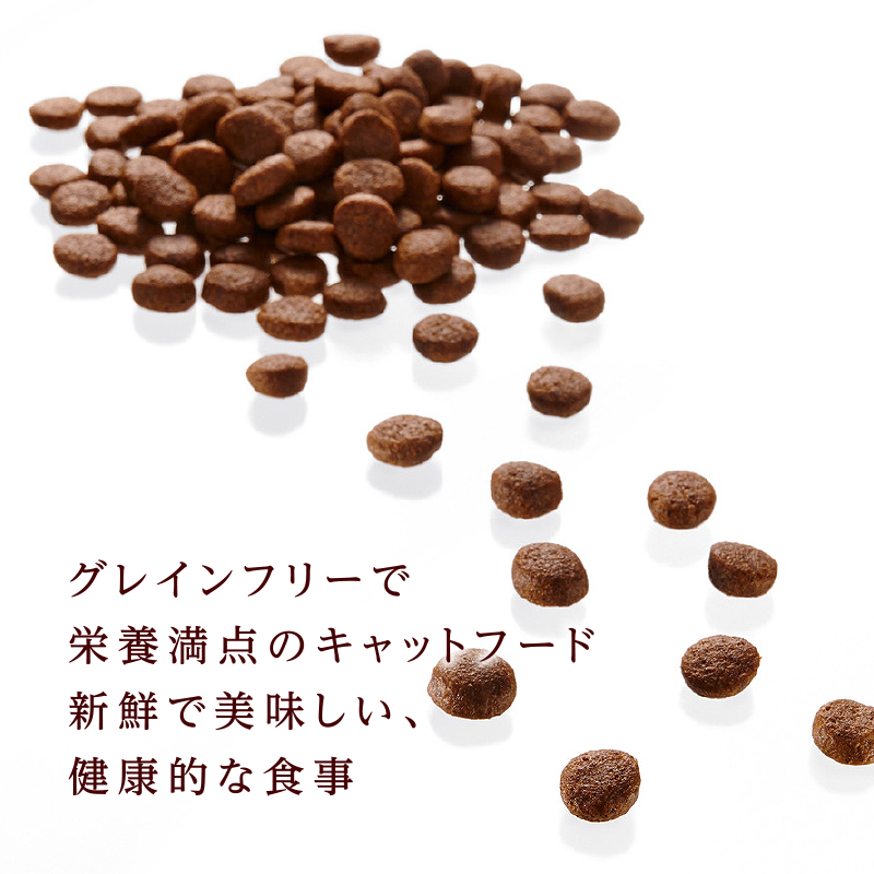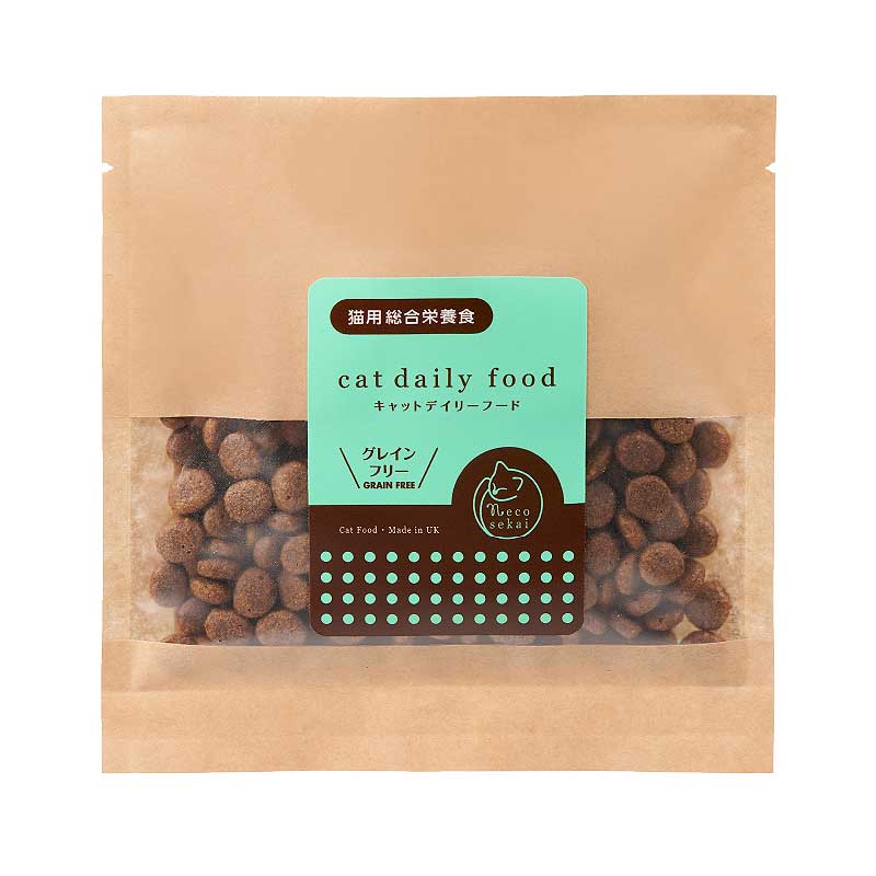 ネコセカイのオリジナルフード「キャットデイリーフード」は、新鮮な原材料を最大限に活かした独自製法とレシピで作られています。栄養価が高くとても消化のよい、良質な動物タンパク源を使 用しているため、毎日おいしく、健康的に食べられます。グレイン(穀物)に敏感な猫や、穀物不耐症の猫にも給与できるよう、サツマイモやジャガイモを使用しました。