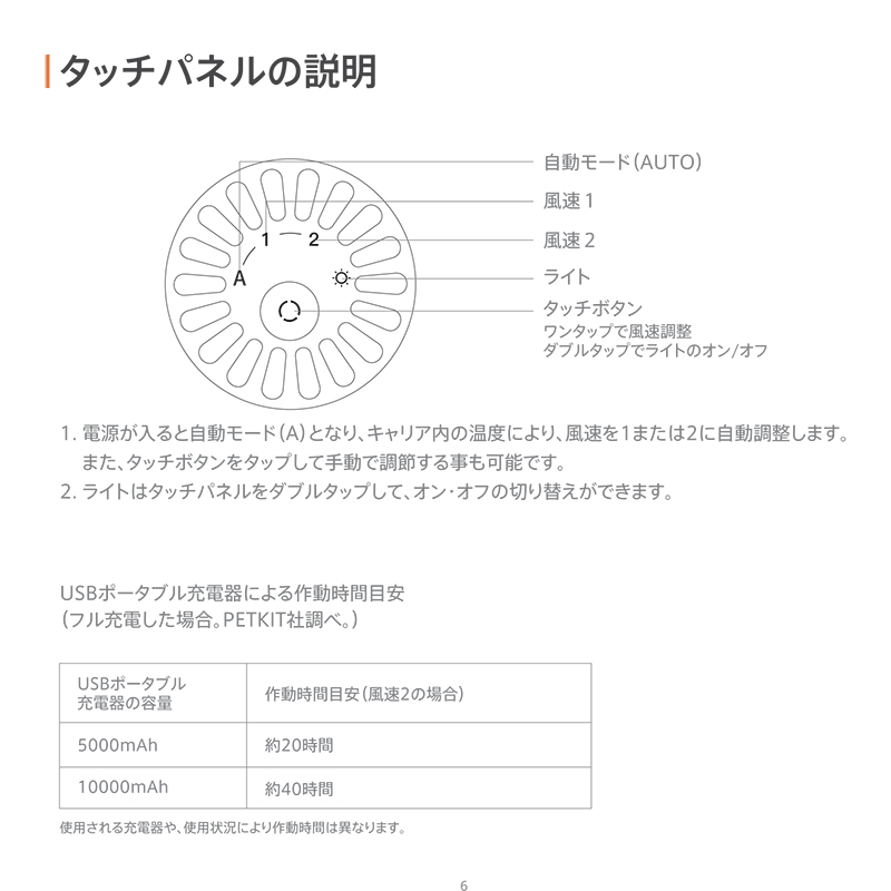 キャリア内の温度に応じて、自動送風・風速調節ができるペットキャリア。USBコード内蔵で、ポータブル充電器(別売)があればいつでもどこでも使用できます。