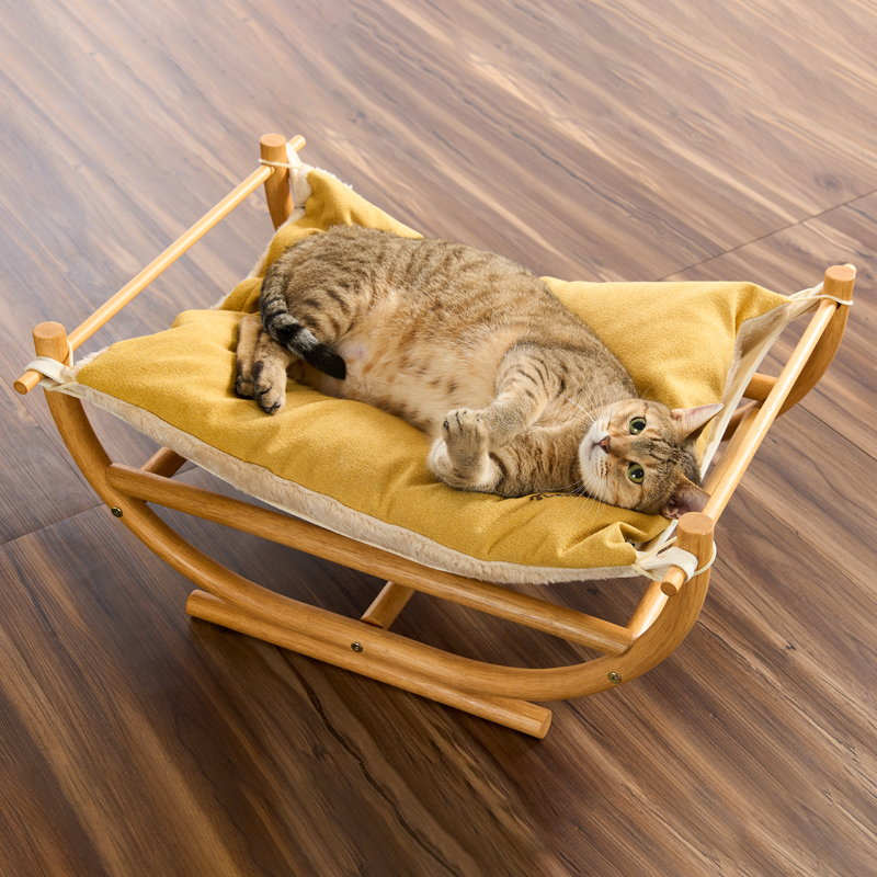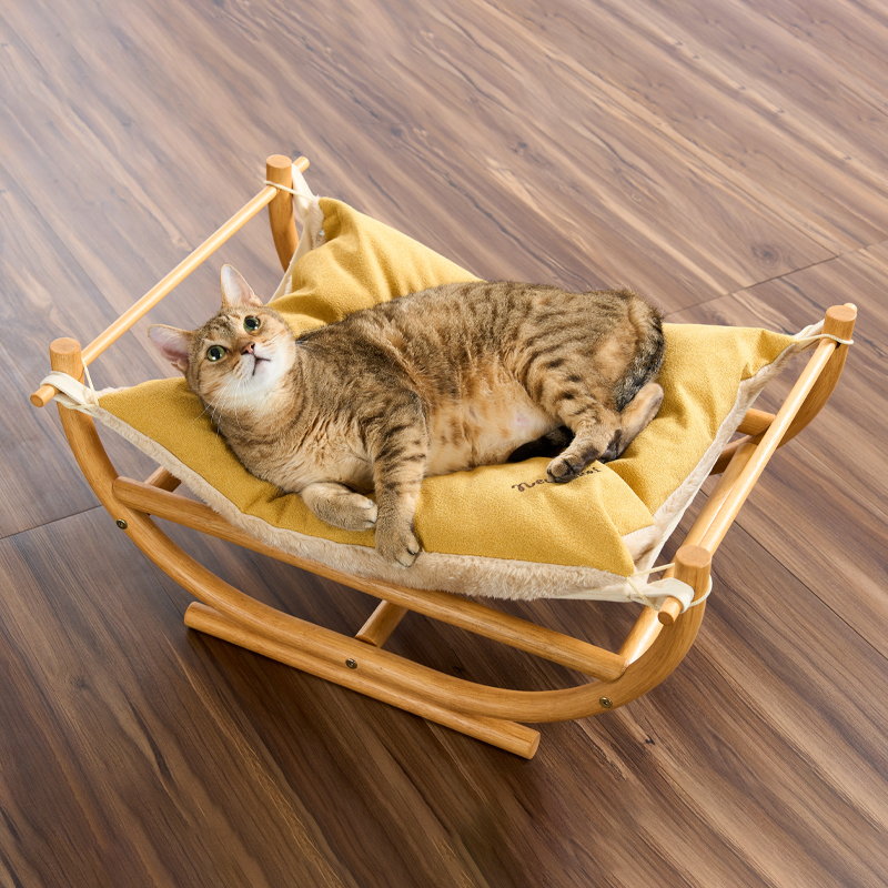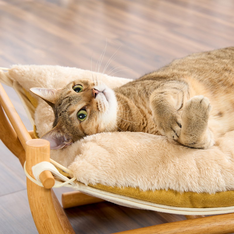 キャットハンモック(別売)は、雲の上にいるような気持ちよさを演出し、木製ならではのやさしい風合いと、しっかりとしたスタンドが特長です。コットン製のマットとクッションの2重構造で、ふわふわで安定した寝心地を実現。きっと極上の昼寝ができることでしょう。
