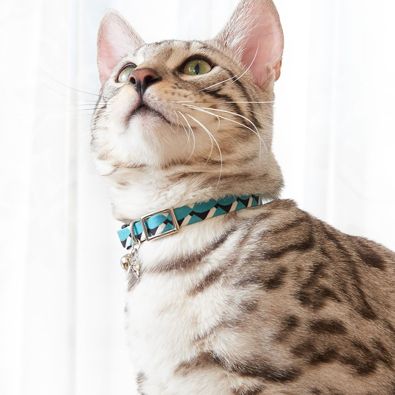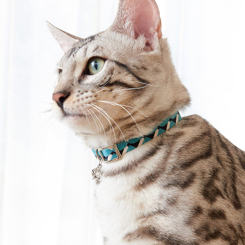 オシャレなトライアングル柄の生地には、しっかりとしたレーヨン100%の素材を使用しています。裏生地にはポリエステル100%を使用。SとMの二つのサイズがあり、それぞれ長さを調整できます。調整金具にはシンプルなシルバーを使用し高級感を演出します。付属のチャームは星をモチーフにしたかわいいスタージュエリーです。小さな銀の鈴も付いています。強い力が加わると安全にはずれるセーフティーバックルを採用。万が一首輪に引っかかっても安心です。