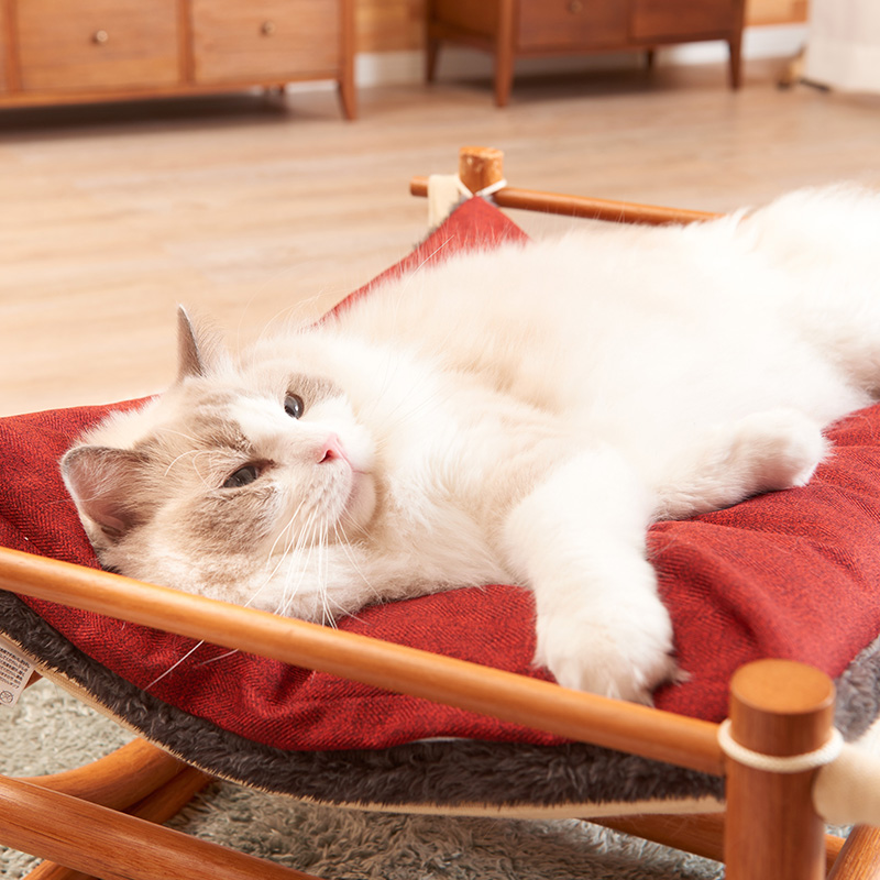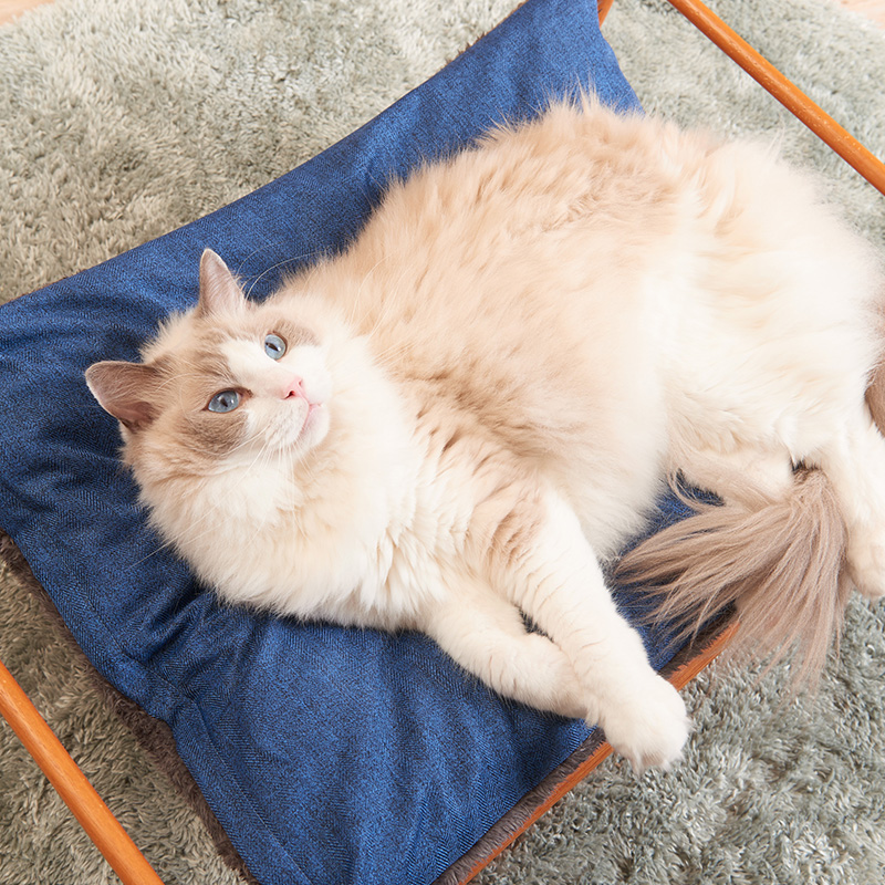 キャットハンモック(別売)は、雲の上にいるような気持ちよさを演出し、木製ならではのやさしい風合いと、しっかりとしたスタンドが特長です。コットン製のマットとクッションの2重構造で、ふわふわで安定した寝心地を実現。きっと極上の昼寝ができることでしょう。キャットハンモック 詳細ページ>>