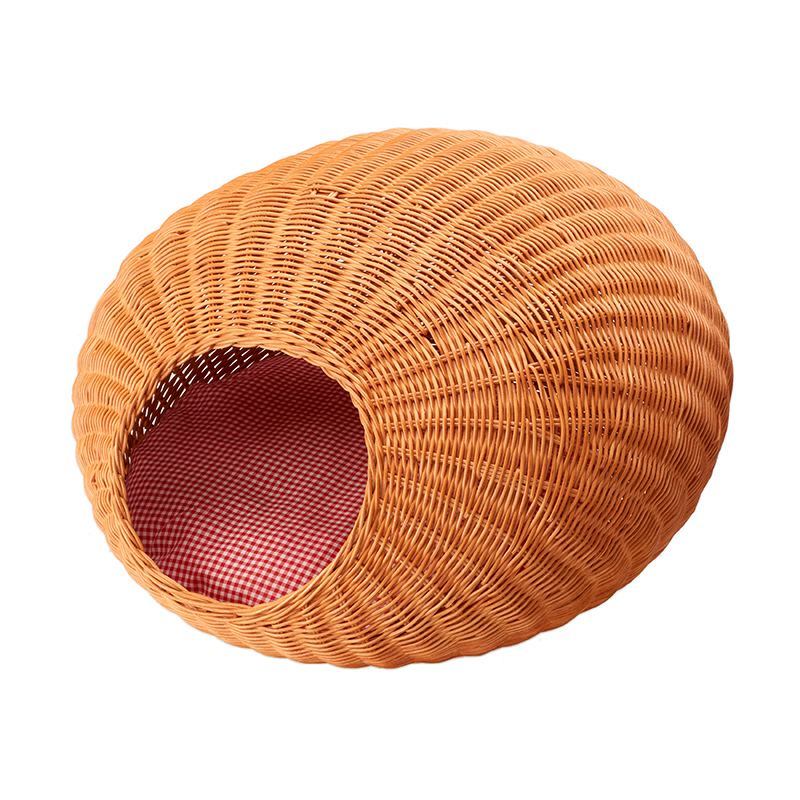 ころんと丸いたまご型のキャットハウス、中は奥に行くほど広くなっているので潜り込んで隠れるのにぴったり。たまごの中でくつろぐ姿はシャッターチャンス。推奨体重〜8kg目安。専用クッション1枚付属(カラー:レッドチェック)、予備クッションカバー(ホワイト)1枚付属。ナチュラルテイストのラタンベッドはお部屋のインテリアとしても最適です。手織りの生地を使用したクッションは手洗いにて洗濯も可能です。上質な天然のラタン(藤)を使い、ひとつひとつ熟練の職人が丁寧に編んで仕上げています。