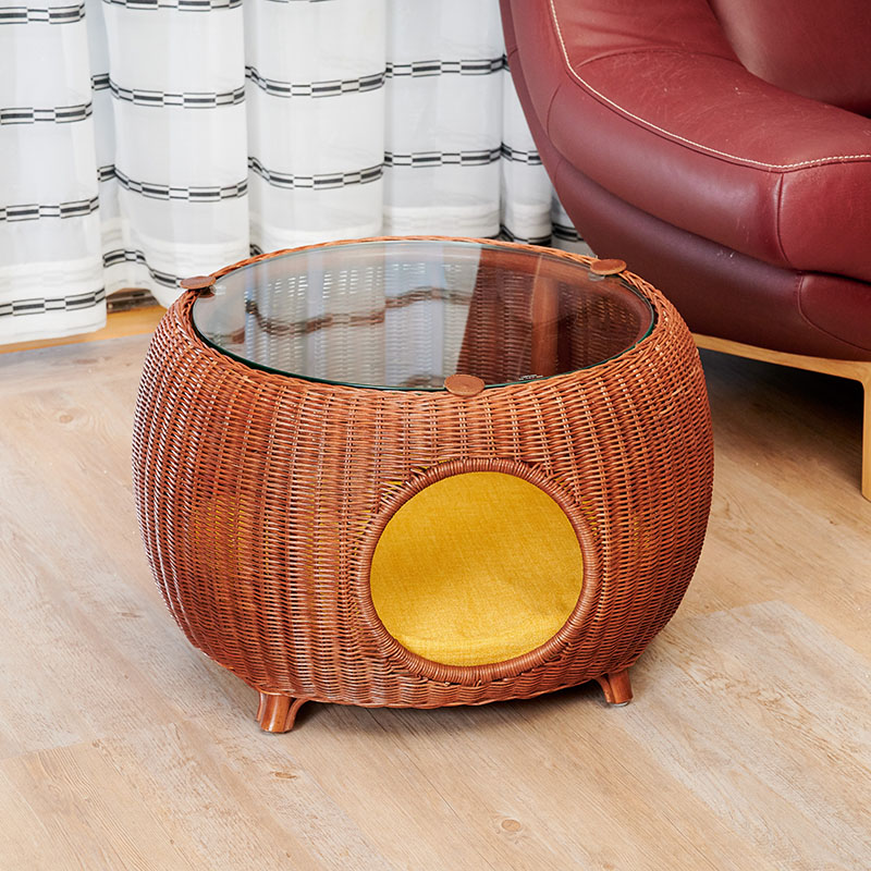 本体のラタンカフェテーブルベッド(別売)は、癒しの時間を実現するスタイリッシュな高級ラタン製ベッドです。ラタン製のおしゃれなカフェテーブルの中に猫さんが入ってくつろげます。天板は強化ガラスですので、テーブルの上から猫さんのかわいい姿を見ることができます。その機能性はもちろんのこと、インテリアの一部としてお部屋に置いてみたくなるような洗練されたデザインです。上質な天然のラタン(藤)を使い、ひとつひとつ熟練の職人が丁寧に編んで仕上げています。プレゼントや贈り物にも最適です。