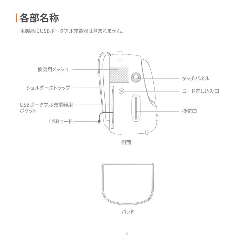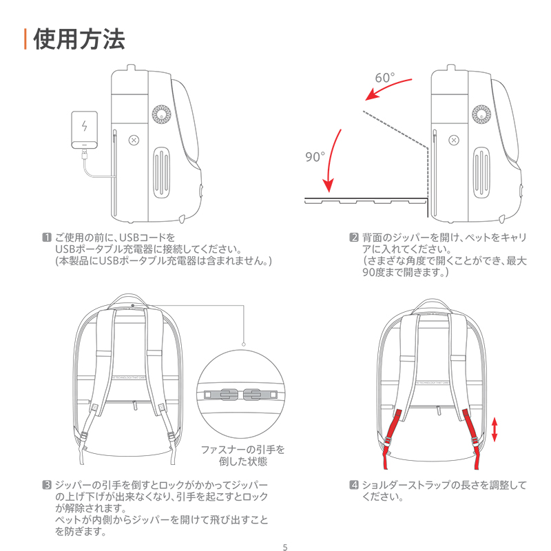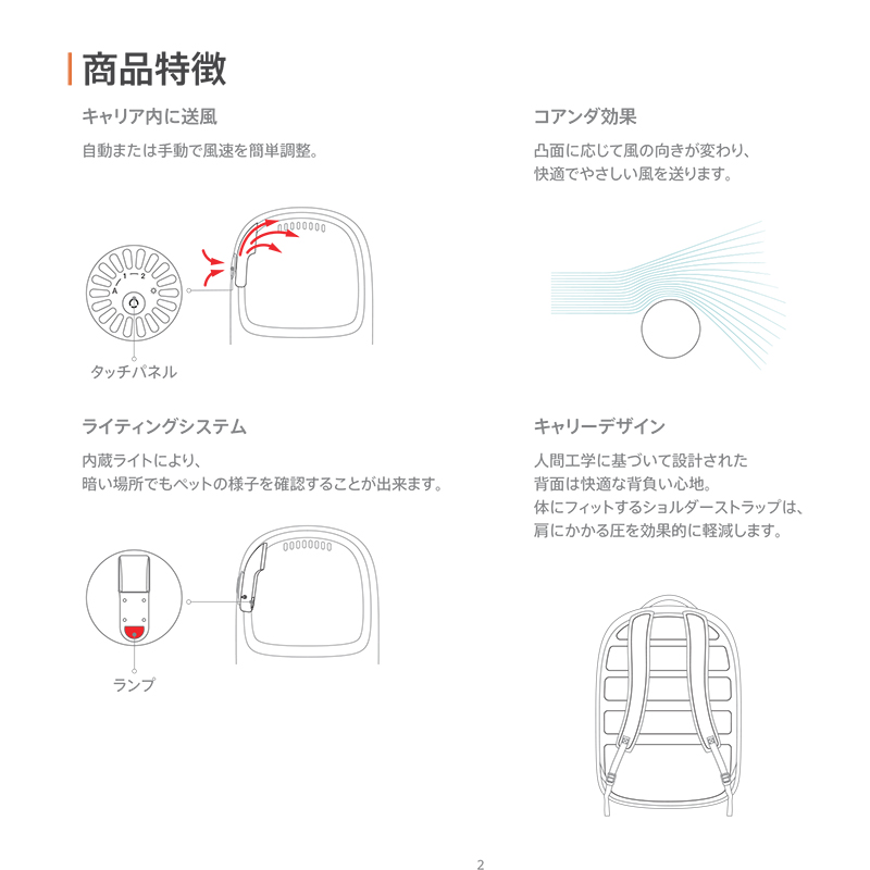 キャリア内の温度に応じて、自動送風・風速調節ができるペットキャリア。USBコード内蔵で、ポータブル充電器(別売)があればいつでもどこでも使用できます。