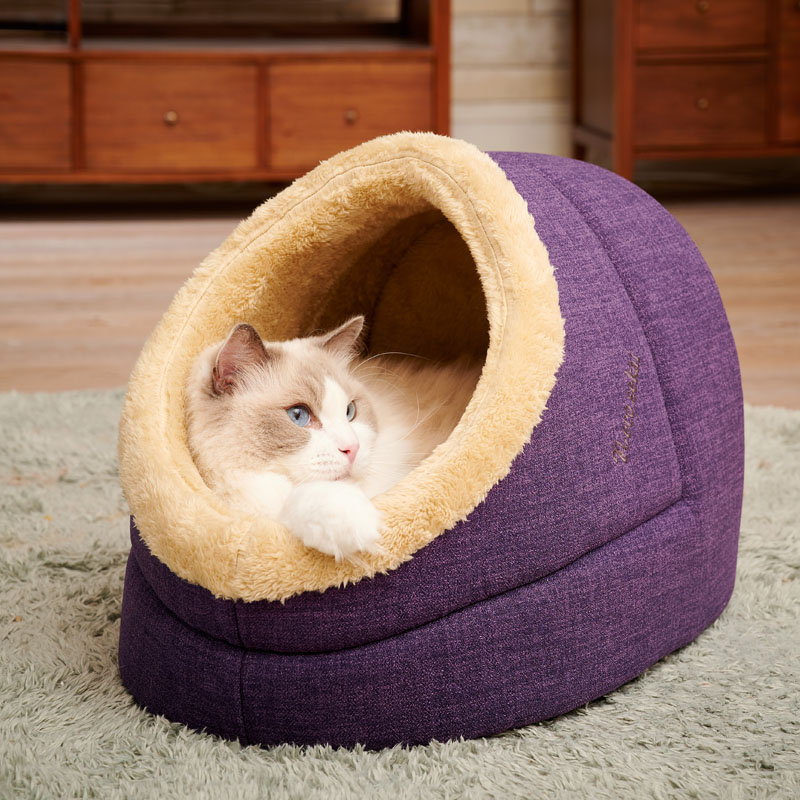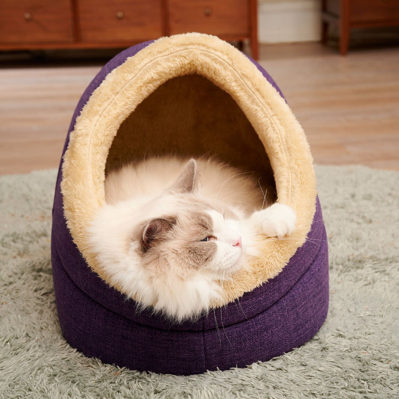 necosekai キャットドームベッドは、肌寒い季節でも猫ちゃんが暖かく快適に過ごせるように、上質さと居心地にこだわったドーム型のキャットベッドです。